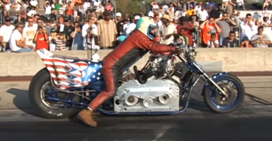 The only thing better than owning a V-8 is putting it on something that should never need a V-8. This badass drag bike is completely ridiculous with its Blown SBC V8. Just looking at the bike alone is a real treat, but watching this guy strap his ass to a rocket and go for a 1/4 mile ride is just plain awesome! Would you be man enough to ride this mean machine?