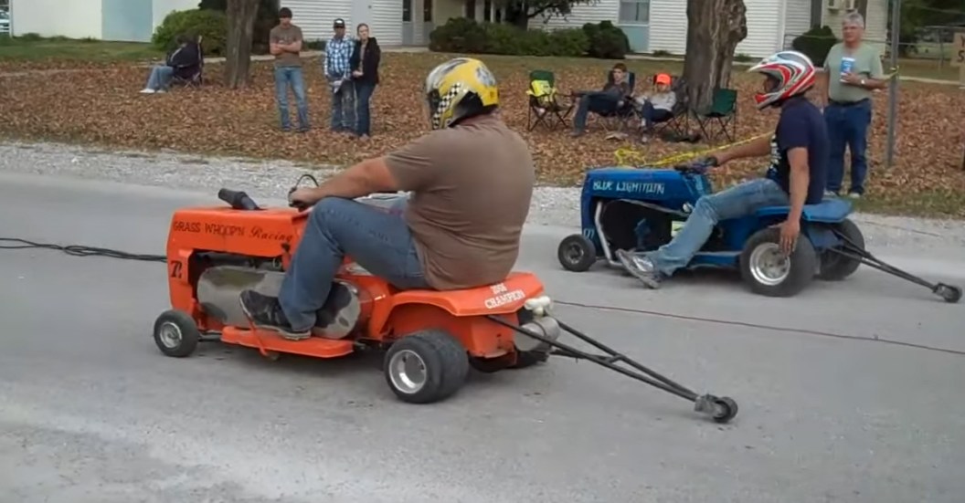 Most people are pretty proud of their riding lawnmowers. These guys take that pride to a whole new level. Typically these lawnmowers run around all of 20 HP but they've got super lightweight frames and construction. They're actually able to move so fast that they need larger, extended wheels put on the back!