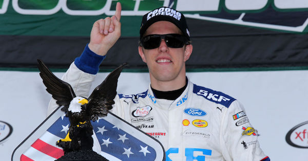 LONG POND, PA - JUNE 10: Brad Keselowski, driver of the #22 SKF Ford, poses with the trophy in Victory Lane after winning the NASCAR XFINITY Series Pocono Green 250 at Pocono Raceway on June 10, 2017 in Long Pond, Pennsylvania. (Photo by Jerry Markland/Getty Images)